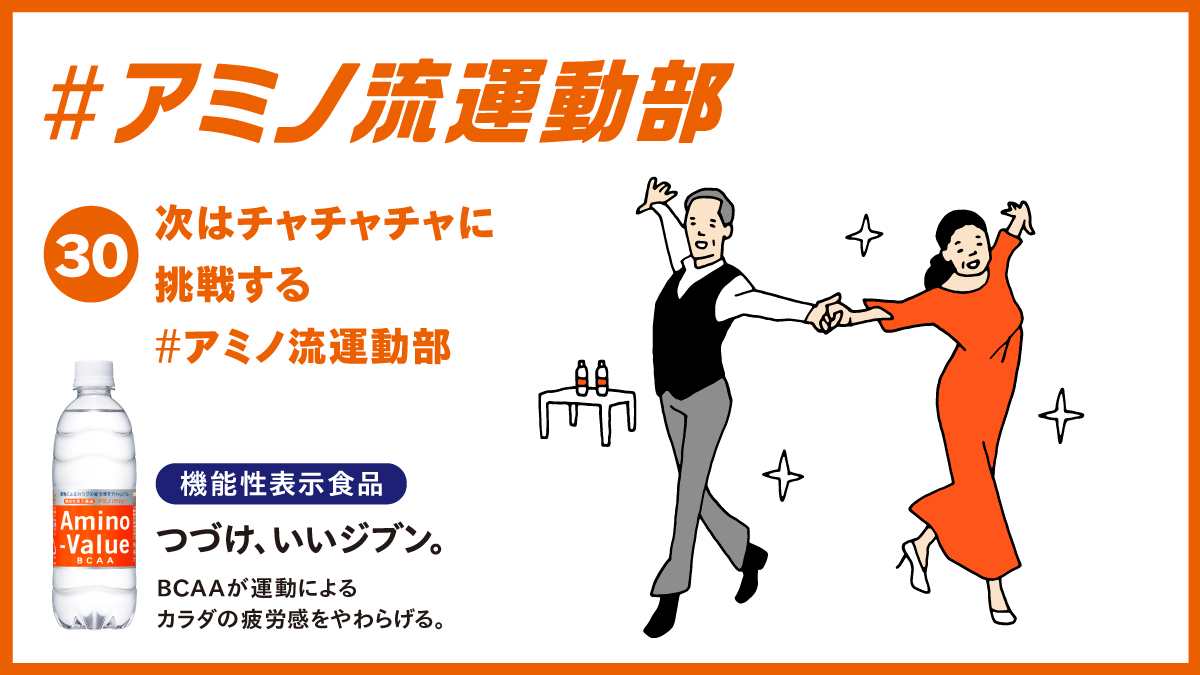 社交ダンスのペア結成からやっと1年。憧れのチャチャチャにいよいよ挑戦!次の大会では絶対キメるぞ!ステップ前には #アミノバリュー 。BCAAが疲労感をやわらげます。