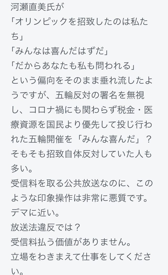 2018年に依頼された時から河瀬直美氏は<物語性をもった作品>で<人の心を動かす>ことを構想していた。そして今「オリンピックを招致したのは私たち」だと人の記憶と意識を都合よく改変しようとしている。とんでもない、#五輪を招致したのは私達ではありません 。記録映画は人を欺く詐術ではない。 twitter.com/iwashi_dokuhak…