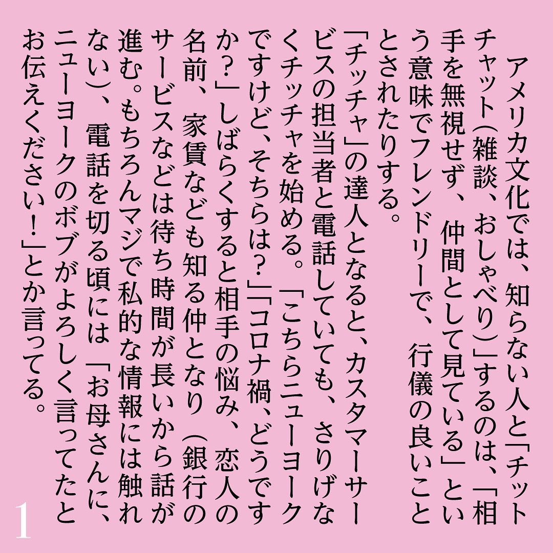 見知らぬ人とのちょっとした雑談をアメリカではチットチャット(Chit Chat)というそうです。飛行機なんかでも隣の乗客には何かしら話しかけるのがマナーだと考えるアメリカ人もいるそうです。