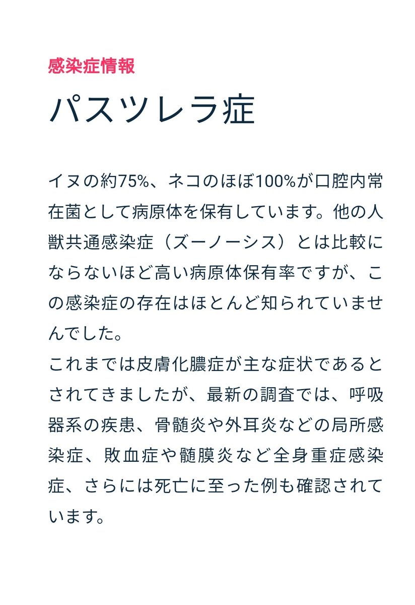 (※現時点で今回の原因がパスツレラ症と確定したわけではありません)