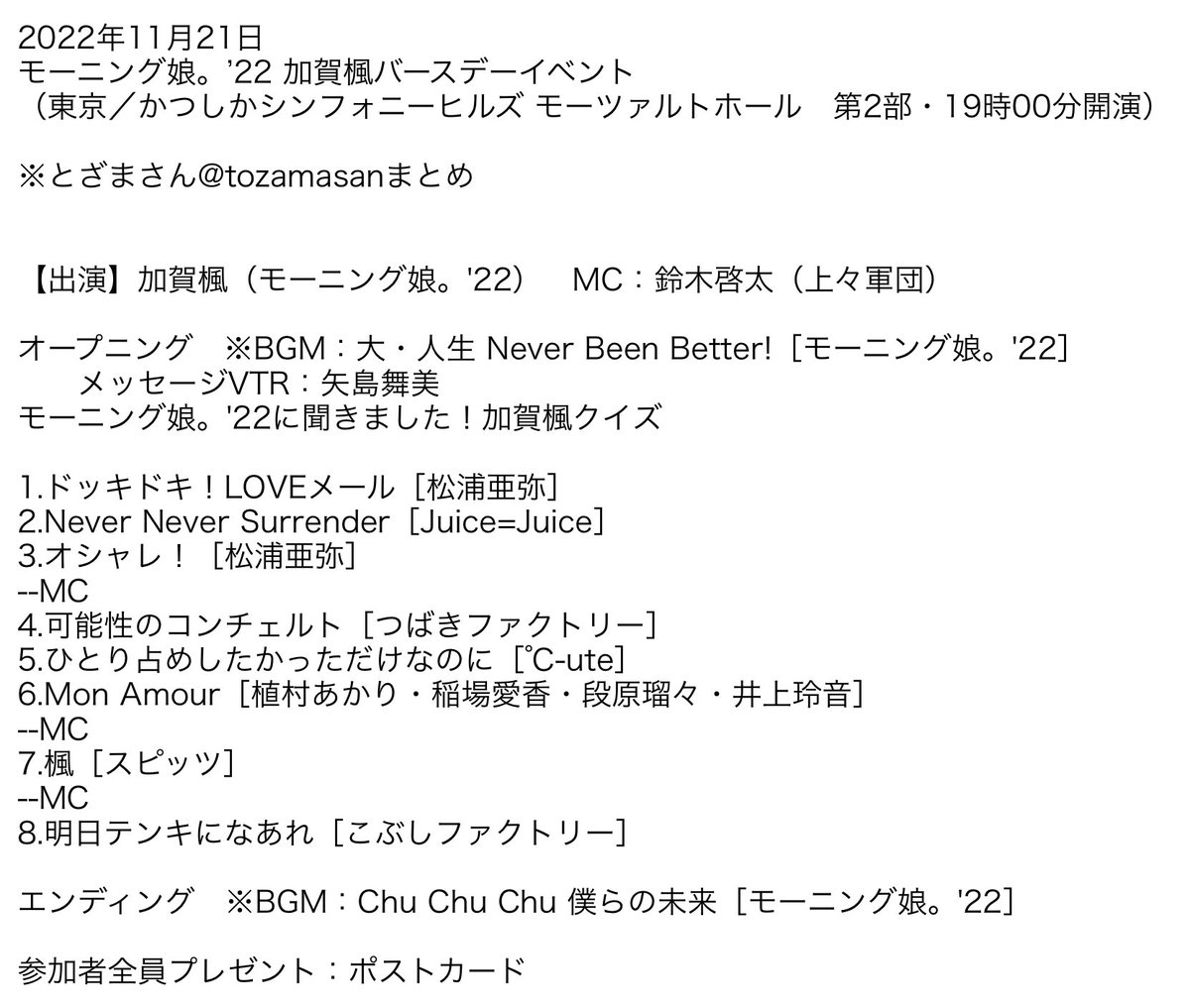 今回の山﨑夢羽さんのバースデーイベントは二十歳ということでママからのお手紙が紹介されたのですが、感動的でありつつ「研修生発表会に来ないでと言われたけど実は愛知のイベントは皆勤賞でーす!お見送り会あると知らず猛ダッシュで逃げました」とかあって笑いも起きたりいいお手紙でした