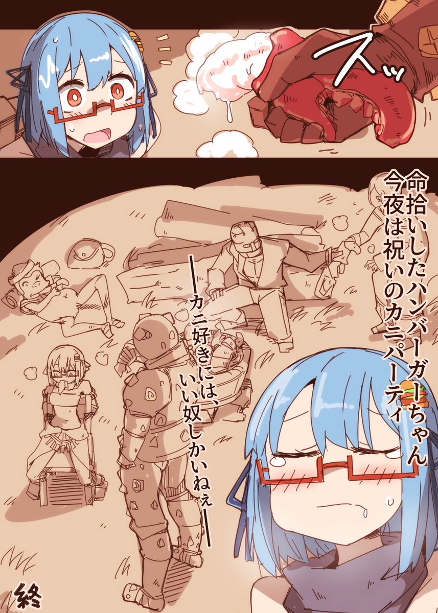 カニをご馳走になったハンバーガーちゃんの絵です