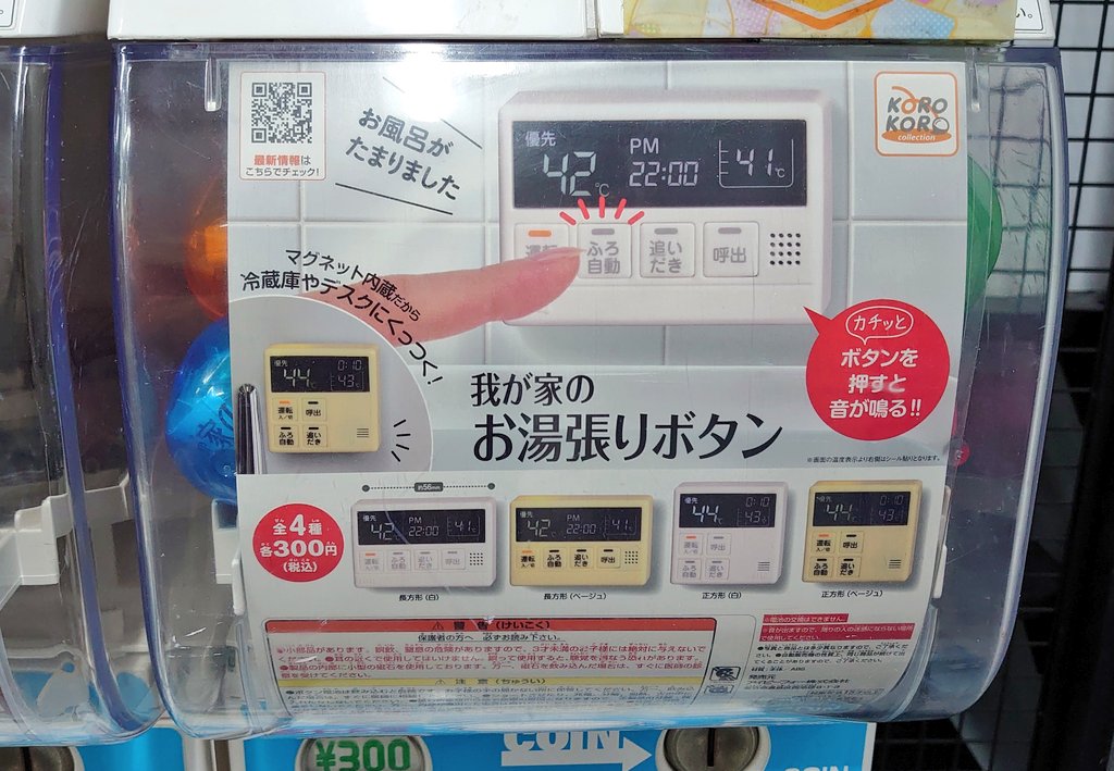 お風呂で給湯器のボタン押しまくる妖怪の為にピッタリのガチャガチャ見付けた~!!!!!早速あげたら喜んでカプセル投げて遊んでる!!