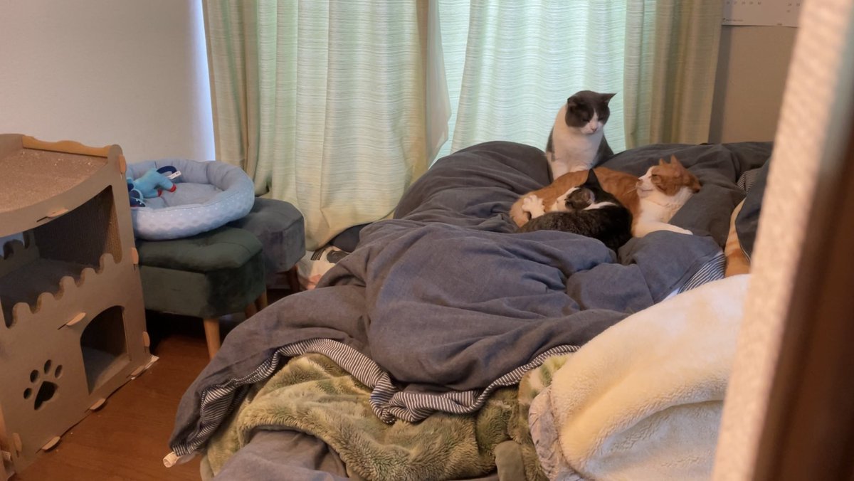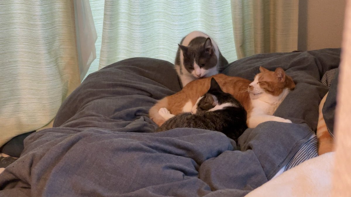 新しく兄弟になった猫たちの近くでクッションを揉むめい君。音は拾えてないけどゴロゴロ喉を鳴らしている。一年お世話されていた保護主さんもめい君のゴロゴロを聞いた事がないそう。保護主さんのおうちでは沢山の猫がお迎えされていくのを見送ってきたと思うけど、そこにいるのは一生一緒の兄弟だよ。