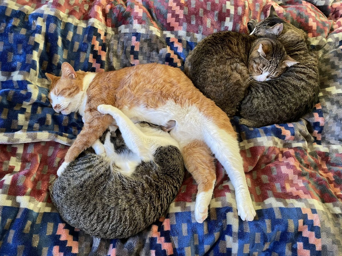 新しく兄弟になった猫たちの近くでクッションを揉むめい君。音は拾えてないけどゴロゴロ喉を鳴らしている。一年お世話されていた保護主さんもめい君のゴロゴロを聞いた事がないそう。保護主さんのおうちでは沢山の猫がお迎えされていくのを見送ってきたと思うけど、そこにいるのは一生一緒の兄弟だよ。