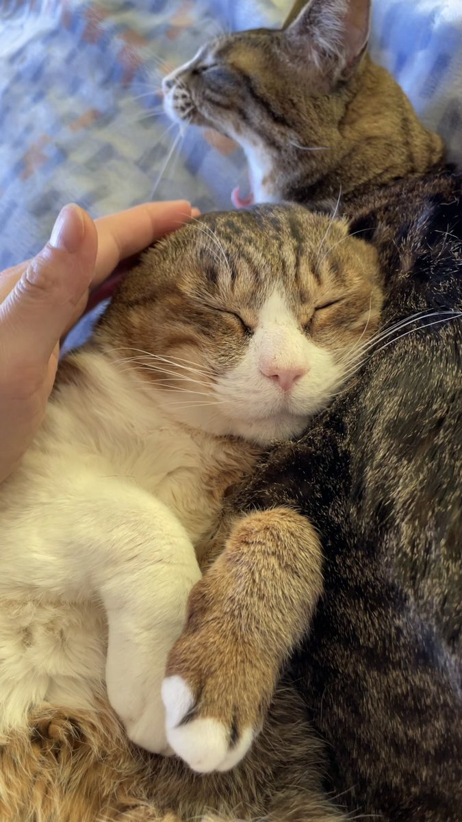 みんなで毛繕いし合ったあと、ちゃしろお兄ちゃんの懐にコロンと潜り込むなだちゃん。隣でリラックスして爪のお手入れをするボス。なだちゃんの頭を優しく舐めるお兄ちゃん。生まれも育ちも血のつながりも関係なく家族そのものだね。