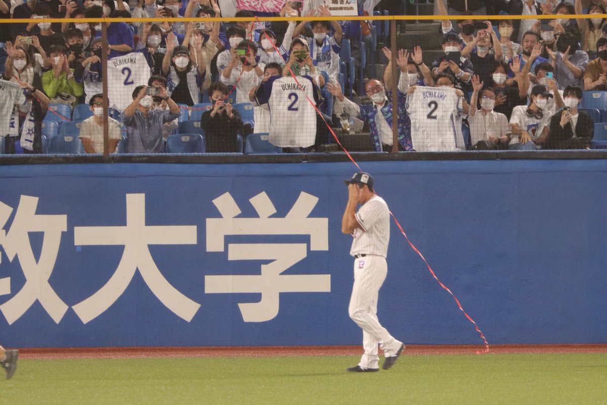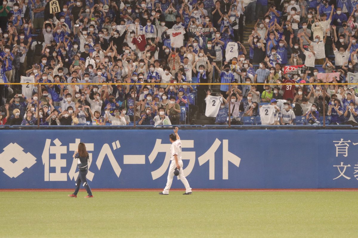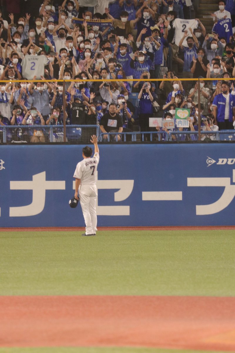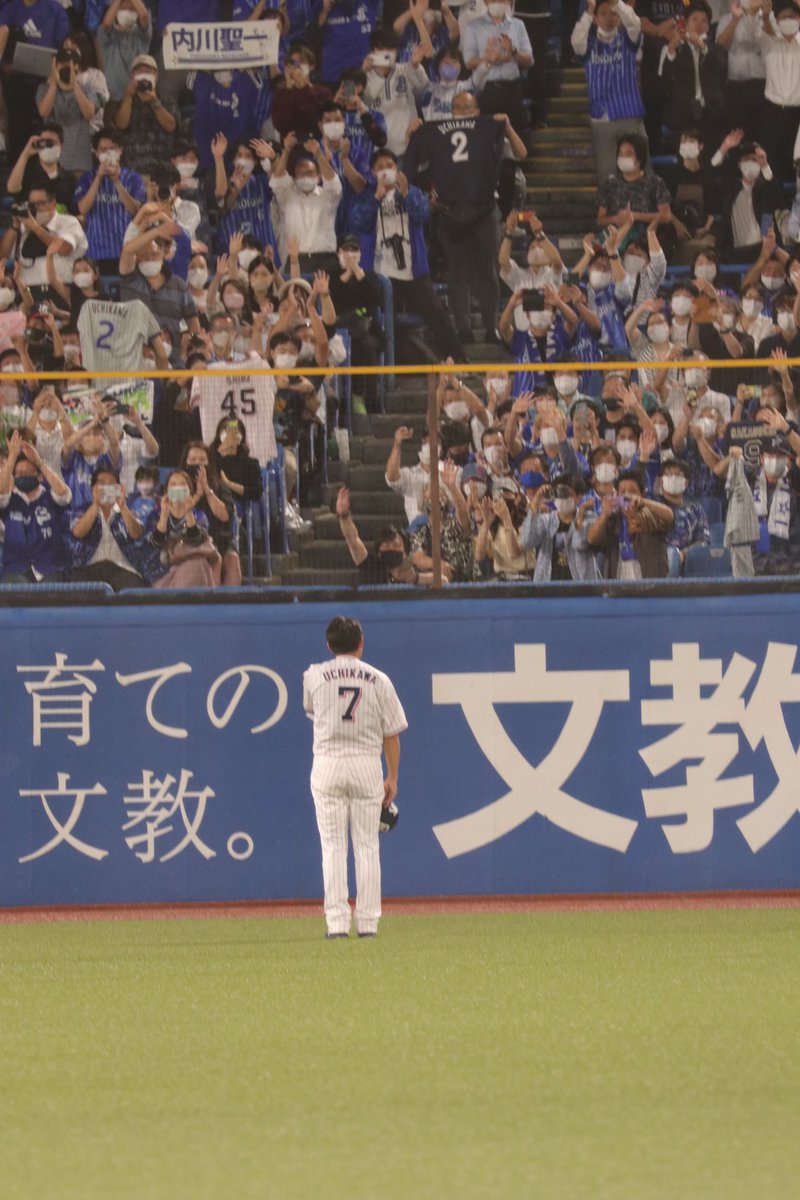 レフトスタンド前で内川さんの足が止まり手で顔を覆った。そこには横浜在籍時のタオルや背番号2のユニフォーム、手作りのボードを持った多くのベイスターズファンが…🥺そりゃ全部溢れ出るよね……