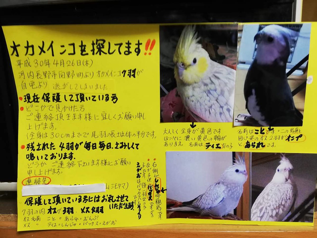 大阪府河内長野市から2018年4月26日にオカメインコを8羽逃がしてしまいました。今も毎日探しています。保護されている方、保護されているのをご存知の方は、このツイッターか河内長野警察署にご連絡ください。私たちは、保護頂いていることに感謝してます。