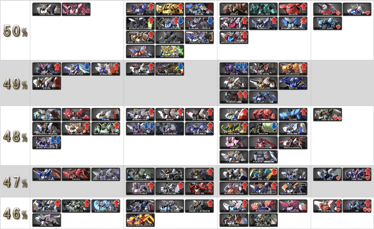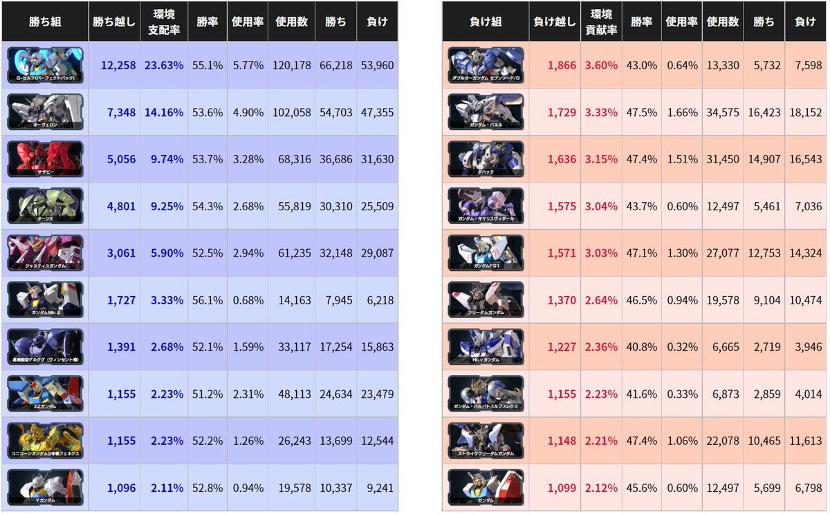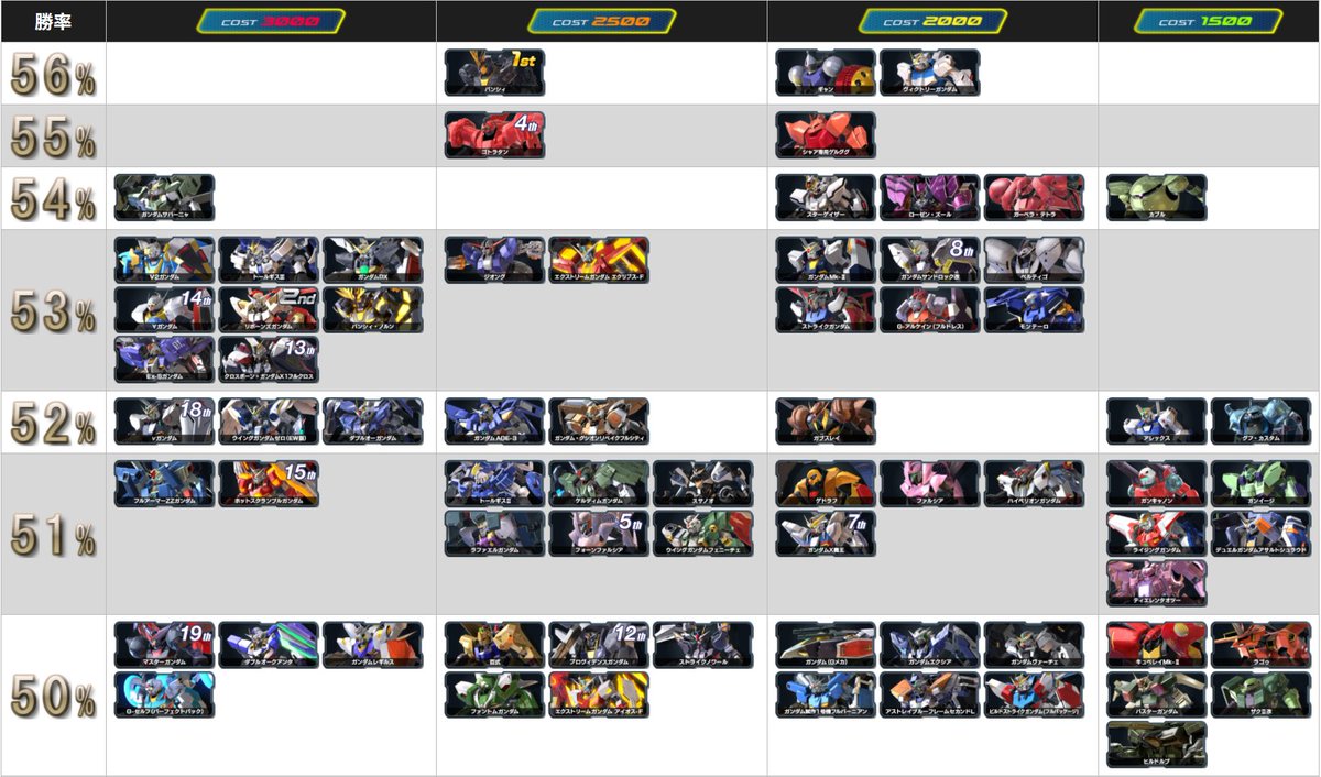 ・勝ち組トップ5: バンシィ、ゴトラタン、リボガン、サンドロック、∀