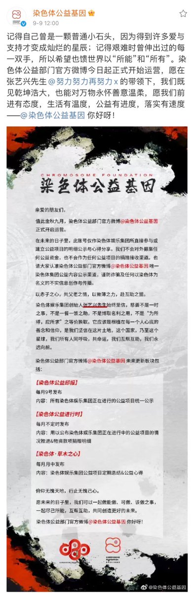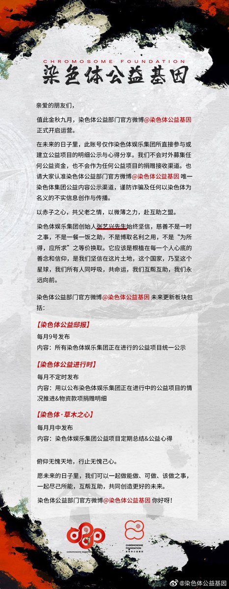 The Public Welfare department of Chromosome Entertainment Group opened its official account "染色体公益基因"on weibo today.