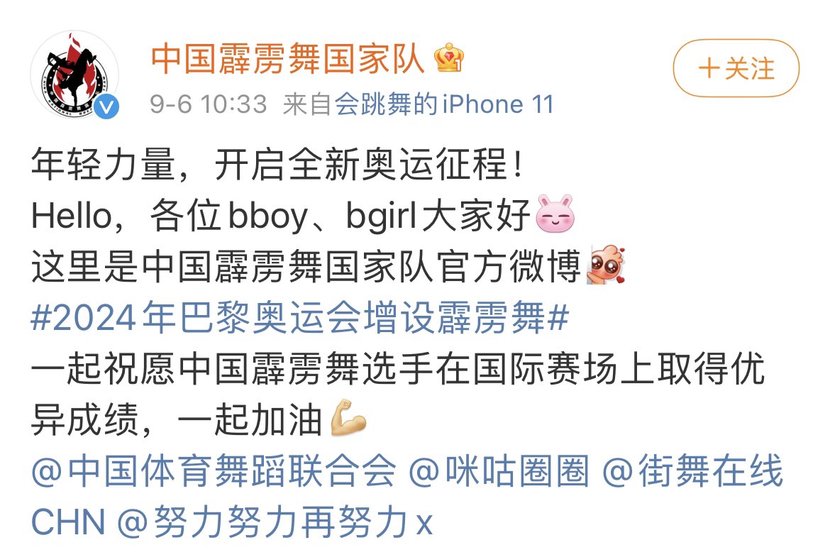 The pinned post in the breakdance’s official Weibo tags Yixing. Let's focus on the street dance and cheers for the Chinese breaking dance players with the ambassador of the street dance, Yixing Zhang.
