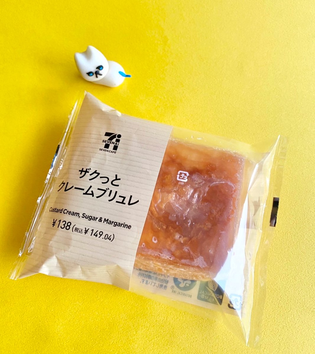 【食べたぜ】セブンの「ザクッとクレームブリュレ」は、表面のカチカチ感が良い!このカラメリゼ部分を、パリッと割りながら食べるのが楽しいんだぜ。デニッシュの中には、甘さ控えめのカスタードクリームが入って、いいバランスだぜ。