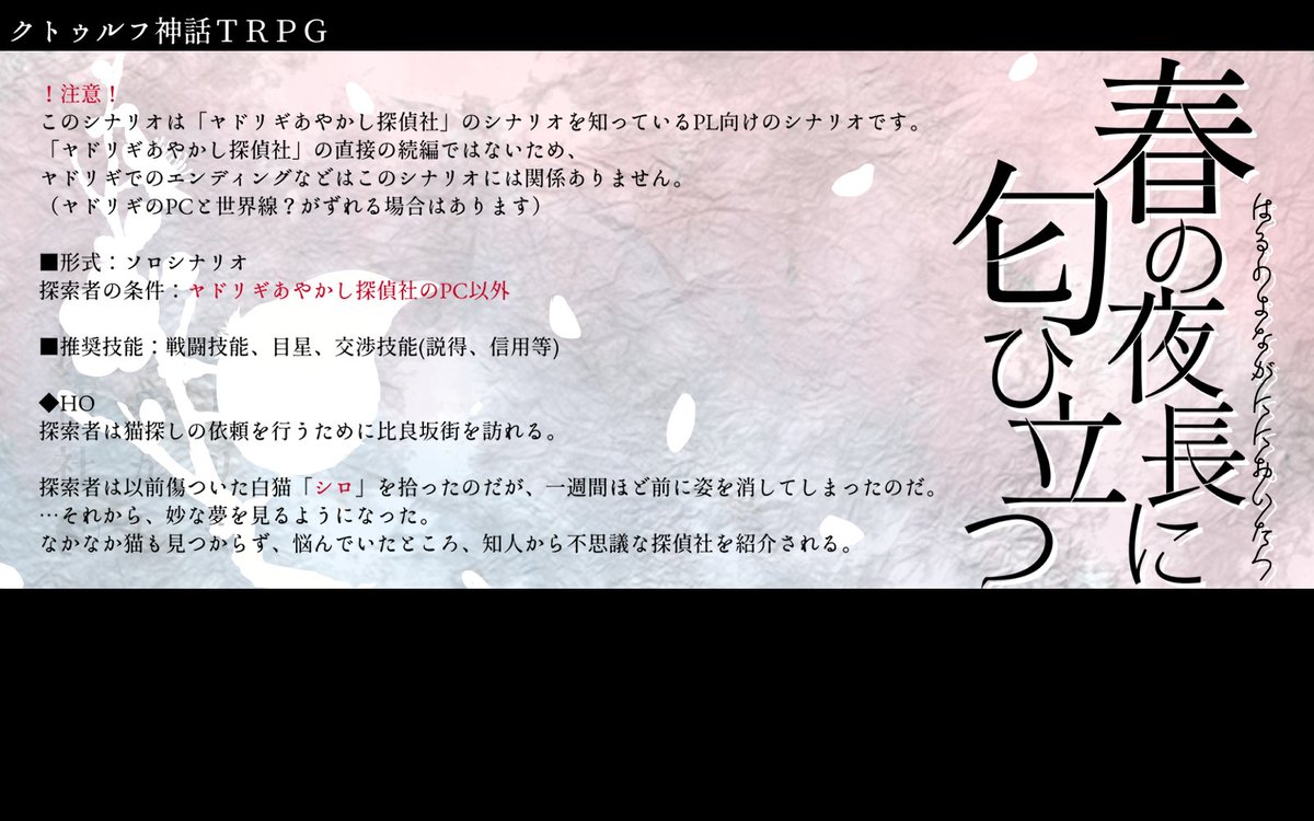 新しいシナリオを頒布しました!比較的怖めのシナリオなのでKP予定の方は試し読みPDFを見ていただければ幸いです!よろしくお願いいたします!