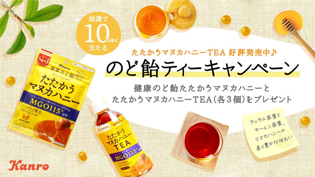 フォロー&RTで10名様に健康のど飴たたかうマヌカハニー+#たたかうマヌカハニーTEA(各3個)のセットが当たる🎁