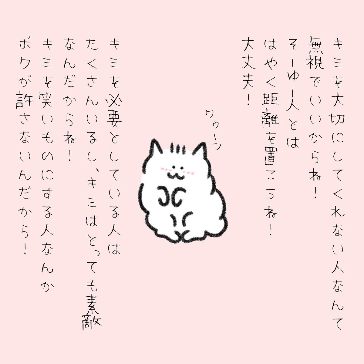 君は悪くないよ、ほんとに悪くない。怒りをぶつけられる矛先にたまたまなってしまって、無駄に傷付けられて、責められて、弱い人が暴れる場所に居合わせてしまっただけで、君は何も悪くないから大丈夫だよ。自分を責めないでね