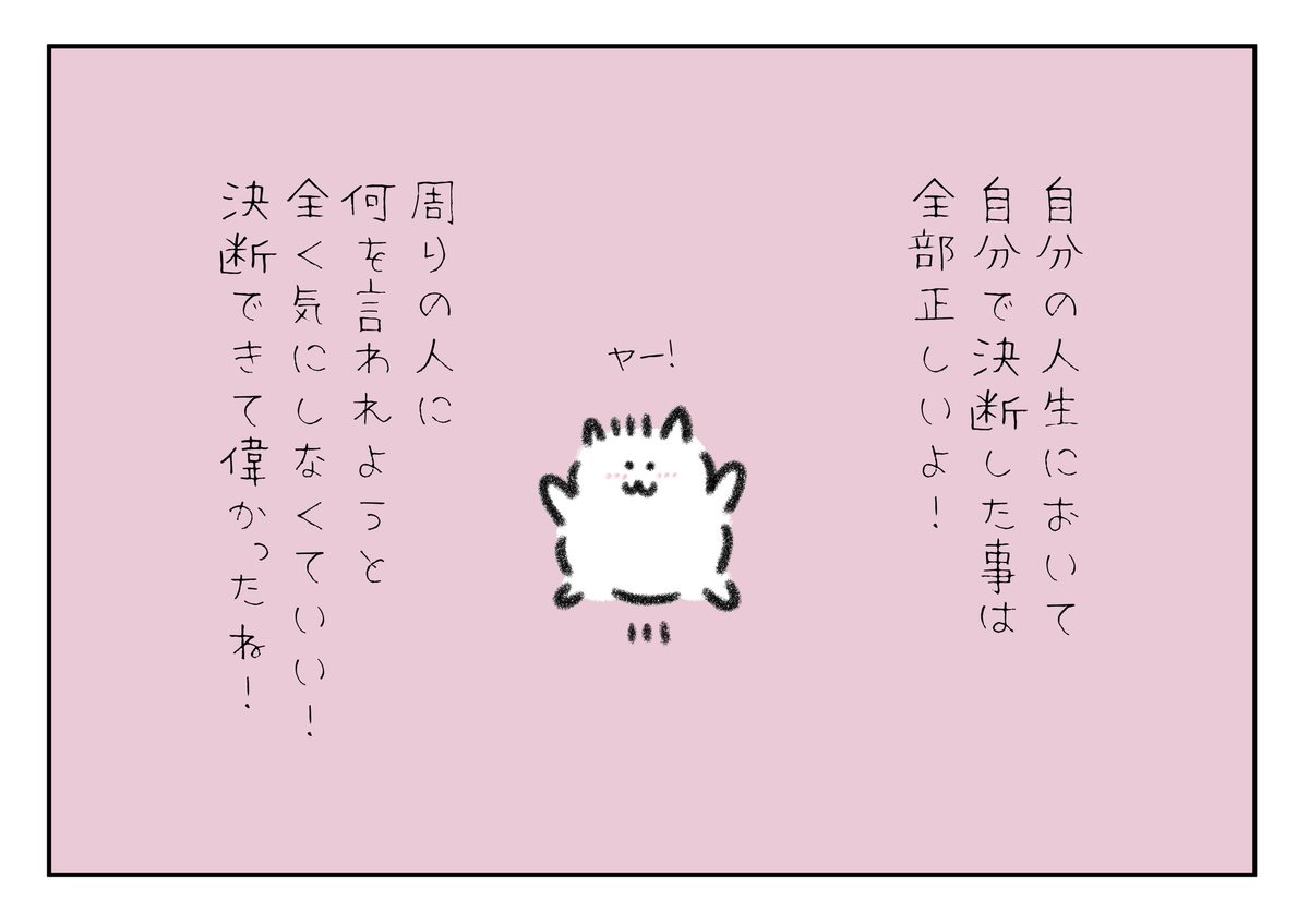他人と比べちゃダメだよ。他人からの評価を信じてもダメだよ。あなたが決めた幸せならそれでいいんだよ。自分の幸せだけでもっと色々な選択をしてね。何をしてもあなたが決めたことなら全部素晴らしいよ