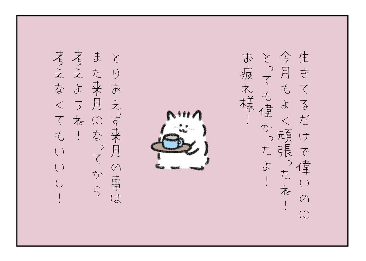 逃げ出さずにきちんと迷って悩んで苦しみ切るあなたは本当は誰よりも強い。今悩んでいることも、不安に思っていることも、数年後必ず解決している。もしくは本当にどうでもよくなって記憶から消えている。大丈夫だよ、全てはいつかどうにかなるか、どうでもよくなる。安心してね