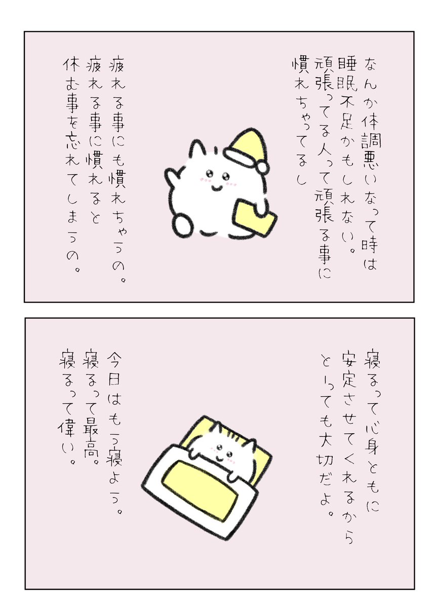 大人になると寝ない理由なんてたくさんあって、人に会うとか仕事とかスマホを見るとか、寝るって難しくて、夜疲れが取れないと日中疲れを取るのはもっと難しくて、だから大事なことを差し置いて、睡眠を1番大事にできる人は本当に偉い。自分を大事にできていて、本当に素敵だよ