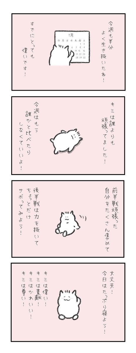 今週も生き延びて偉いね、泣きたい時は泣いて、声出して泣いて、自分にハグして、あったかいお風呂で温めて、弱ってる時は息出来てるだけで十分。たくさん褒めてあげてね。いつも毎日頑張ってて偉い。頑張り屋さんでちょっと弱い君は世界一尊い存在だよ、今日も一日お疲れ様。偉いね、よく頑張ったね。