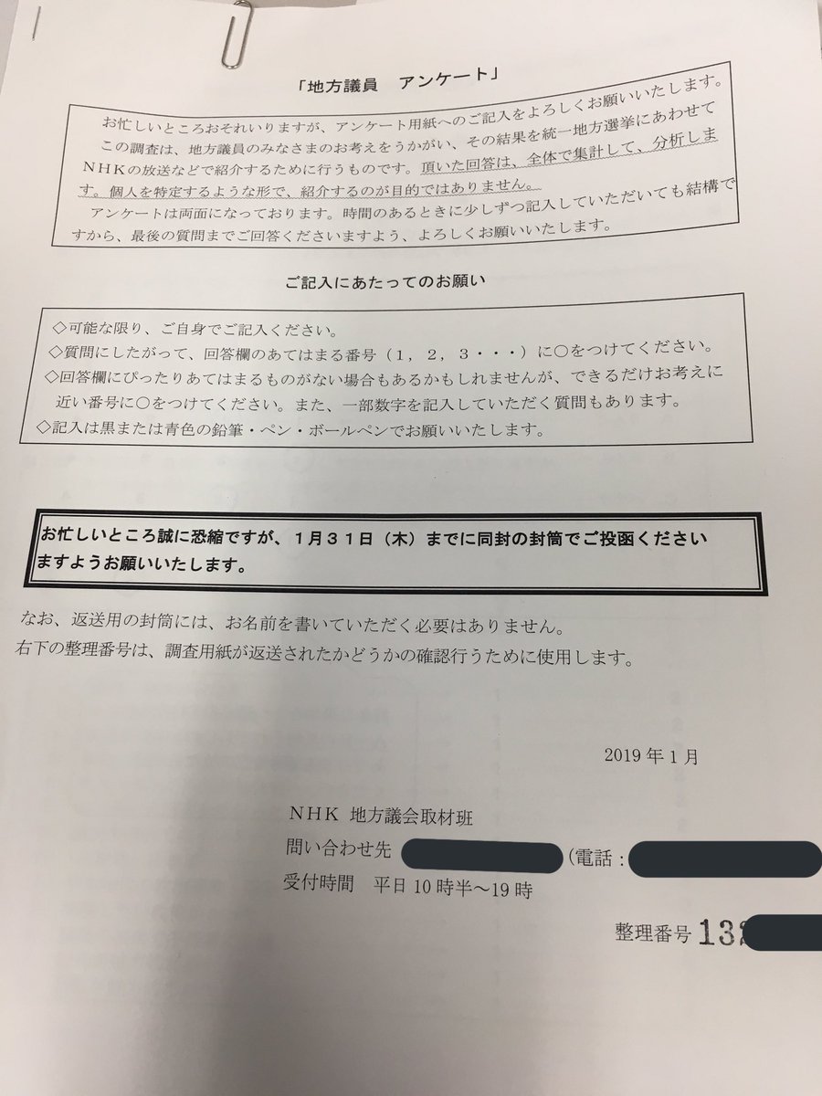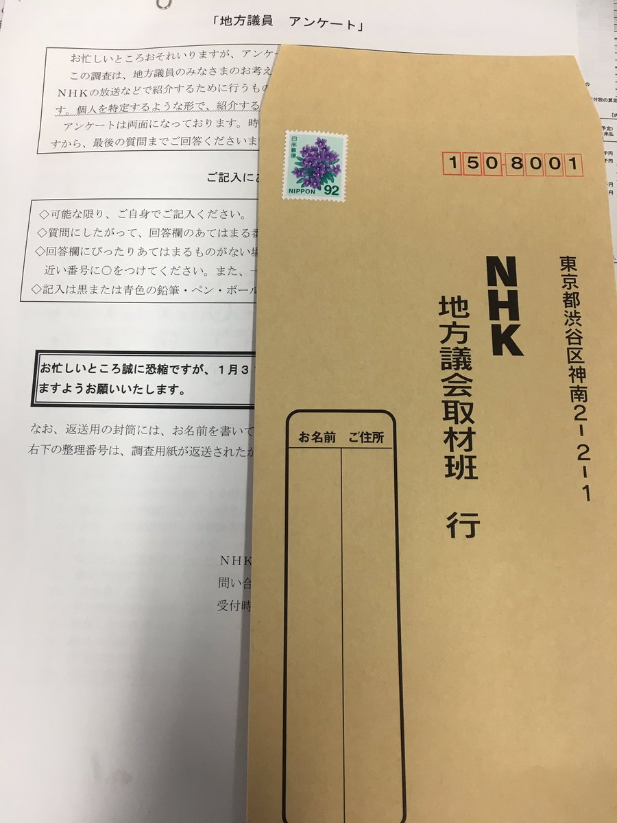 今日、市役所に来たらNHKからアンケート調査の茶封筒が来てました。 ずるいのは名前は不要といいつつ無意味な整理番号で管理されてるんですよ。もし調べようと思えば各個人の考えがNHKに丸わかりってことです。 勿論、記入しません。 さて明日は立川の立川市内の農業視察、意見交換会に行ってきます。