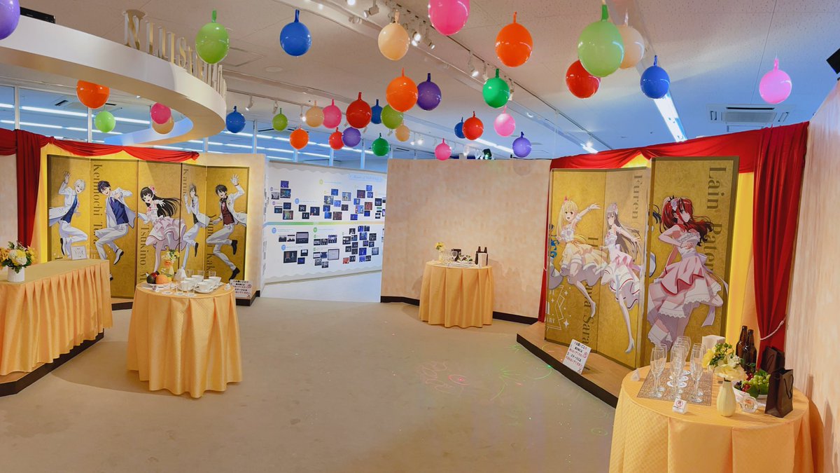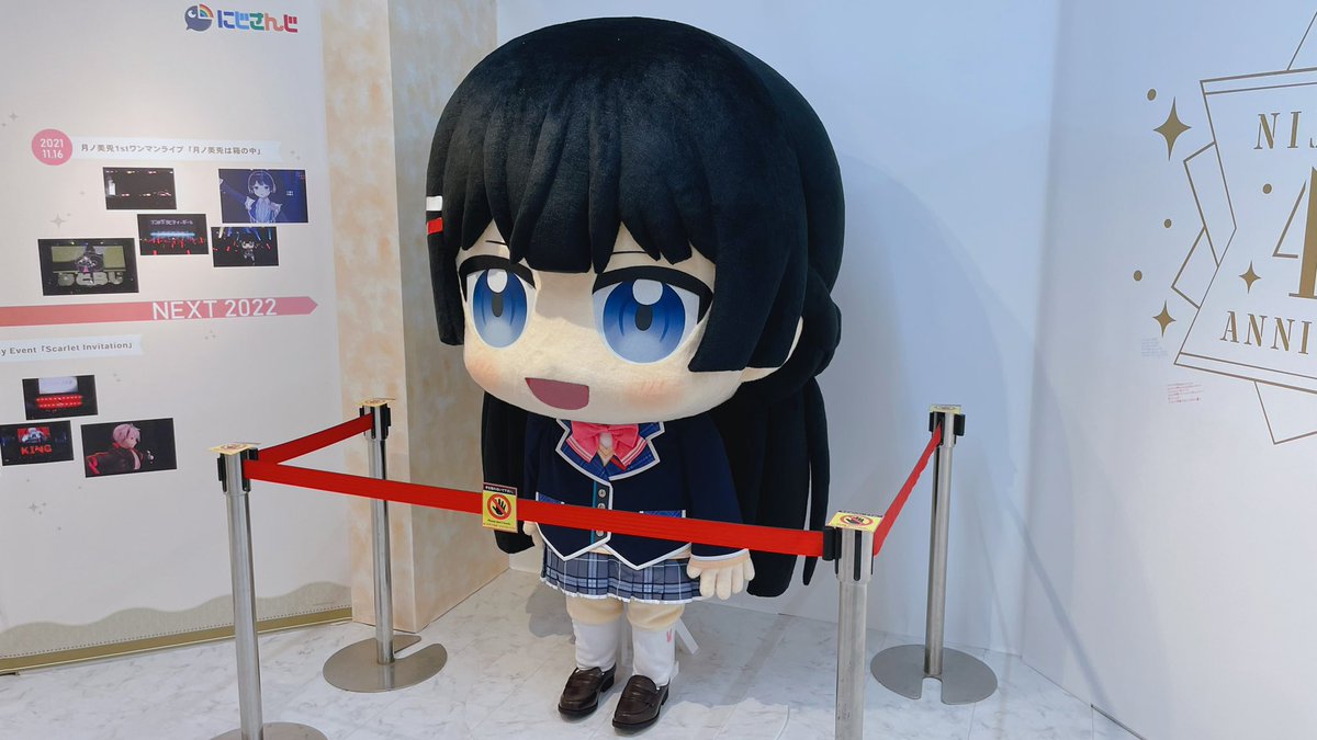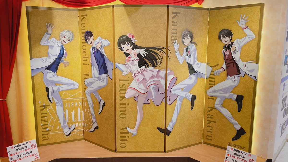 にじさんじ4周年記念アニメイト池袋本店オンリーショップ。展示物こんな感じでした。歴代イベント映像と一緒に金屏風パネルとか年表とかミトダヨ-ちゃんが展示されてました。
