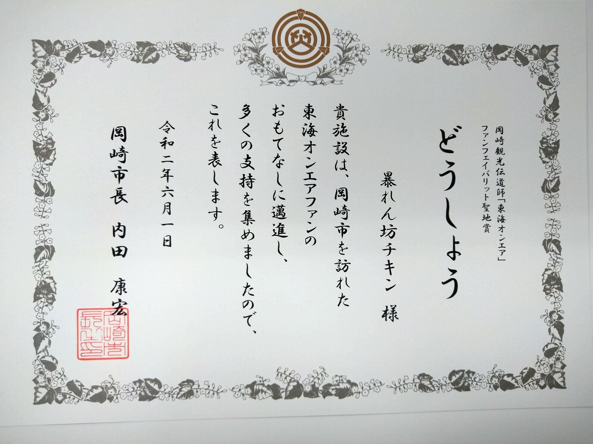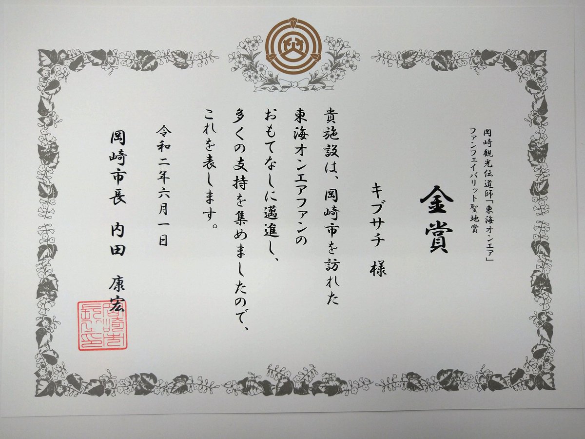 この賞状に市長印押せるのは岡崎市くらいでしょう。