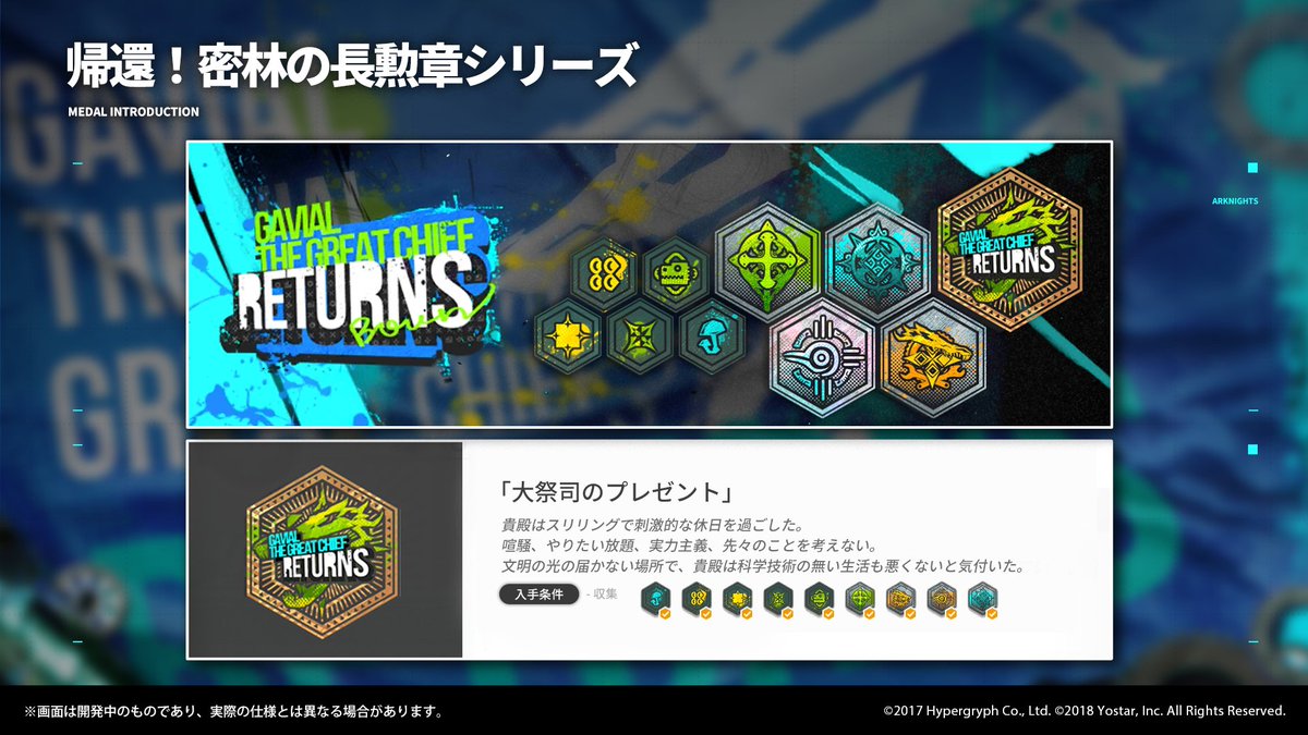 現在開催中のSIDE STORY「帰還!密林の長」では、イベント限定の功績勲章シリーズを揃えることができます。