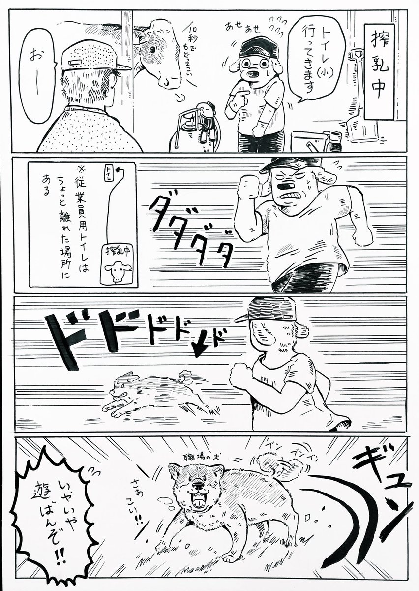 『犬と猫と牛とトイレに行きたい従業員』 ※汚い話でごめんなさい(3枚目) あと、漫画で言ってるトイレ(小)はおしっこのことね。念を押しておくね。