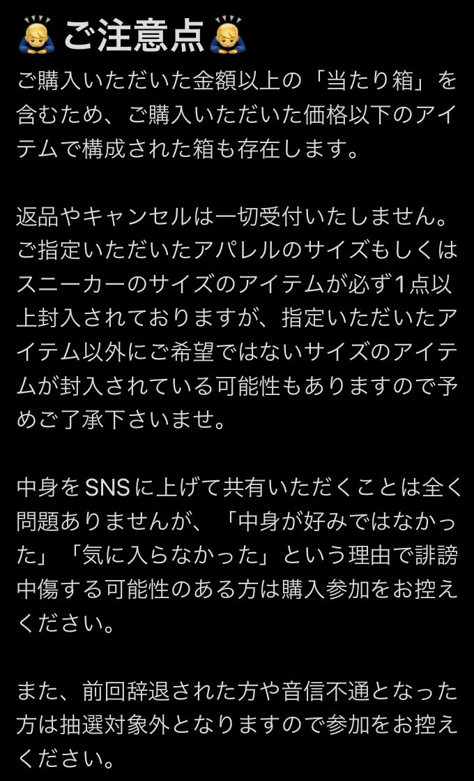 伝票剥がした上で、適当に選んだ箱から出てきたものと同じカラーサイズをコメントしてくださっている方の中から当選者を選びます👍🔥🔥 twitter.com/bobusannnn/sta…