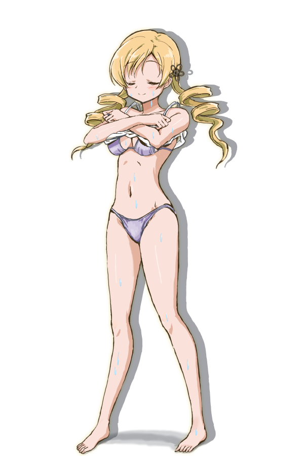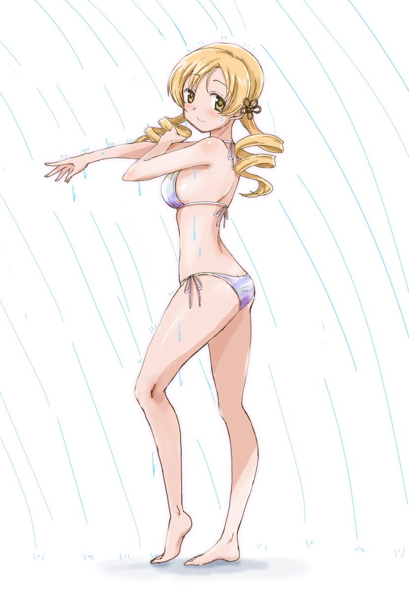 シャワー浴びマミさん水着。白背景。