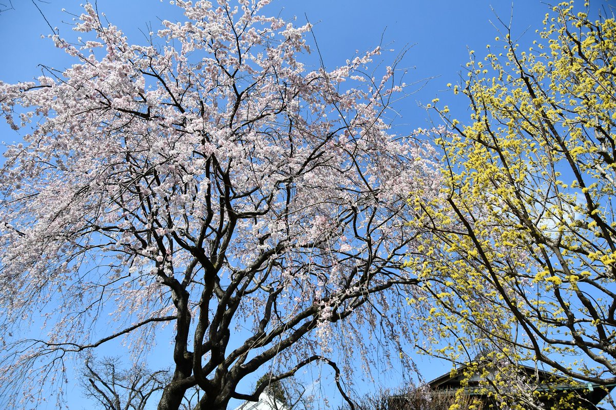 濃いピンクの桜もあれば淡いピンクもあり、山の手通りから西ゾーンの奥、茅葺きの民家周辺でご覧いただけます。本日の強風で花の様子が心配ですが今のところ大丈夫そうです。お越しの際はぜひご覧ください。