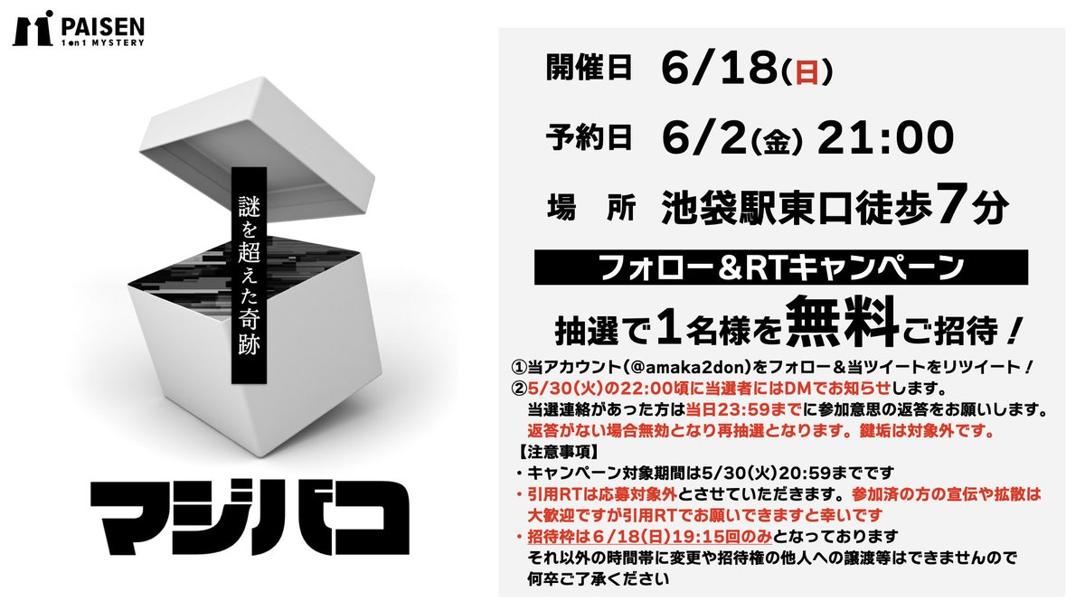 6月に1日限定で再演します。前回に引き続きフォロー&RTキャンペーンもありますので是非。 謎解きゲームでしか味わえない楽しい体験を用意してお待ちしております。