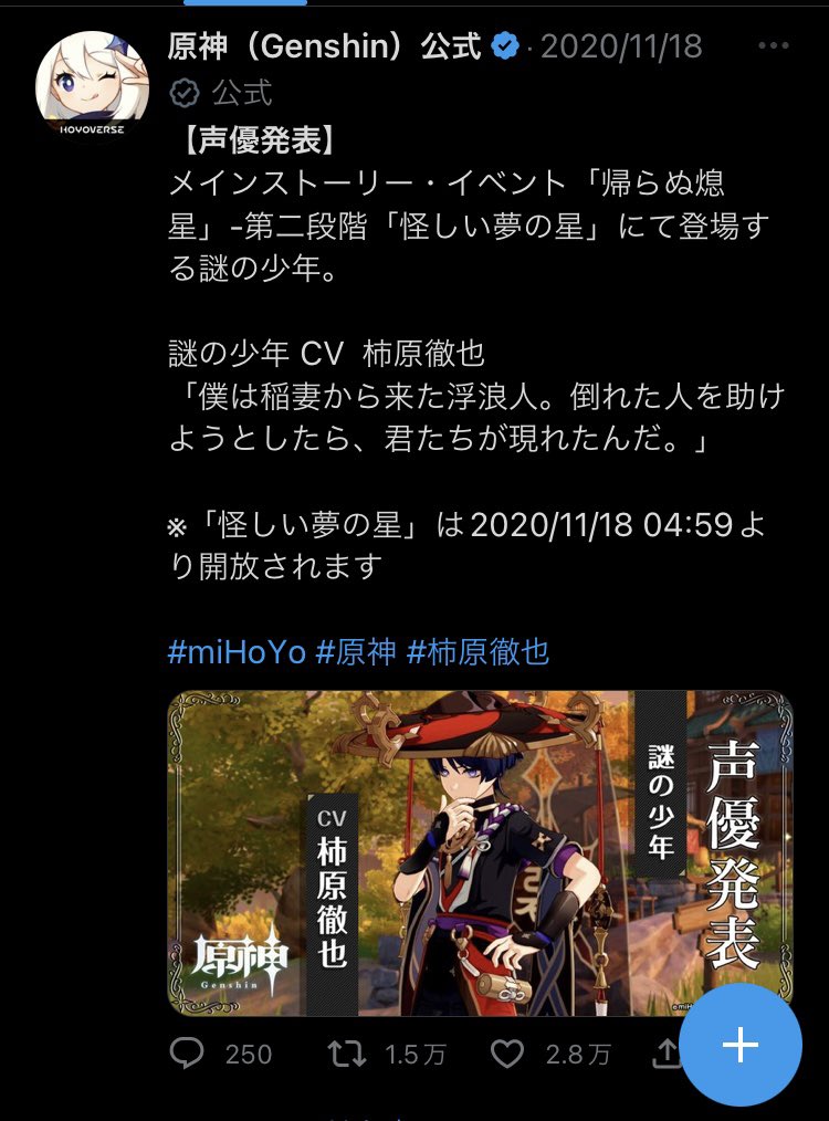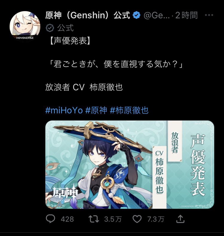 散兵くん、実は原神がサービス開始してから「2番目」に公式Twitterで声優が発表されたキャラクターです