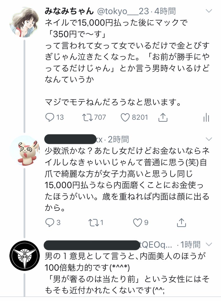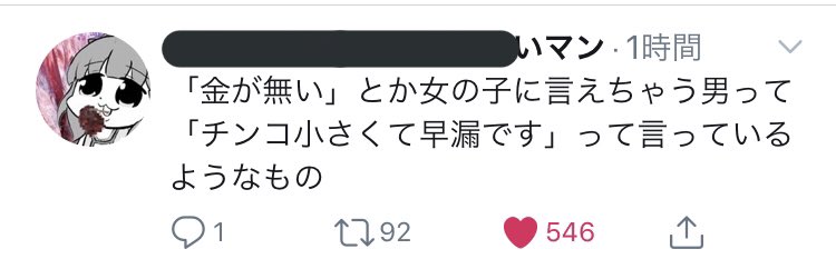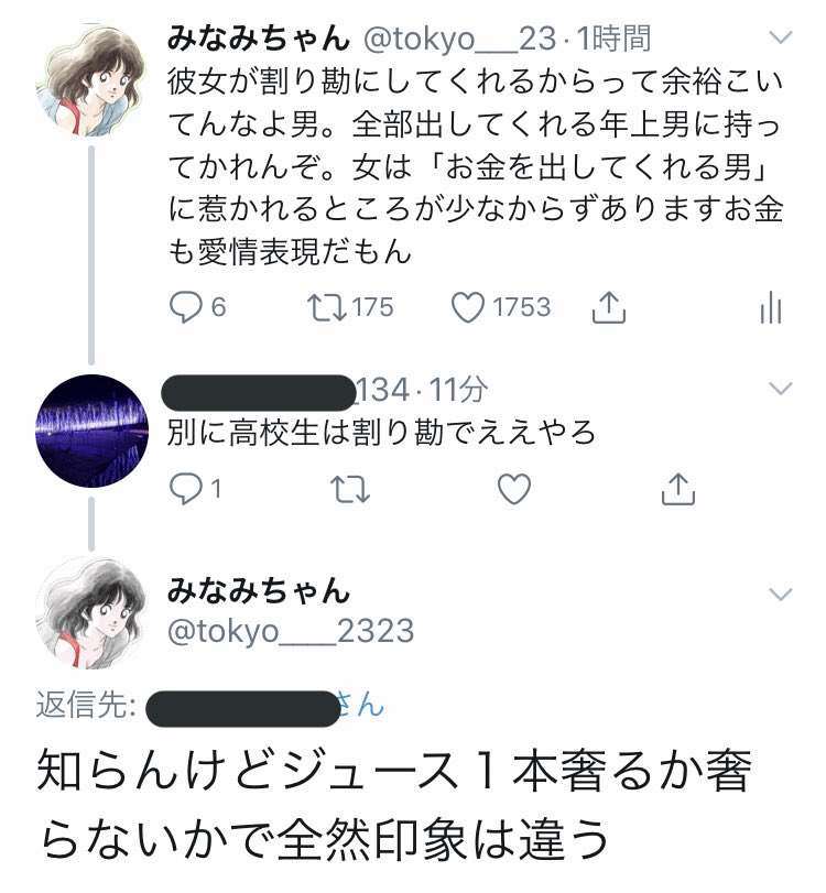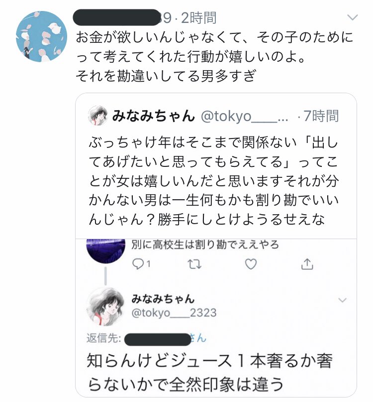 女は奢ってもらえて当たり前とまでは思わないでもやっぱり女にお金出させない男素敵だなとは思う。女は男にある程度カッコつけてほしいもんだよ超金欠なら月1カフェ代だけでもいいじゃんそれだけでも女嬉しいと思うって話なのにアンチ出現すんの何?思考回路違いすぎる分からない苛つくから消えて