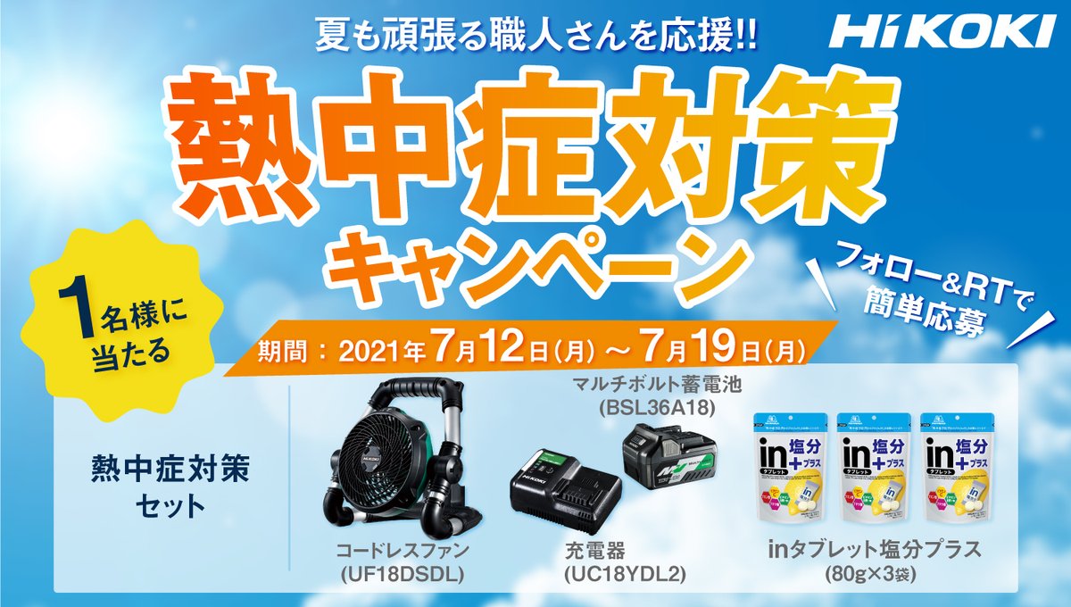 「ハイコーキのコードレスファン(蓄電池・充電器付)」と「inタブレット塩分プラス(80g×3袋)」がセットで1名様に当たる