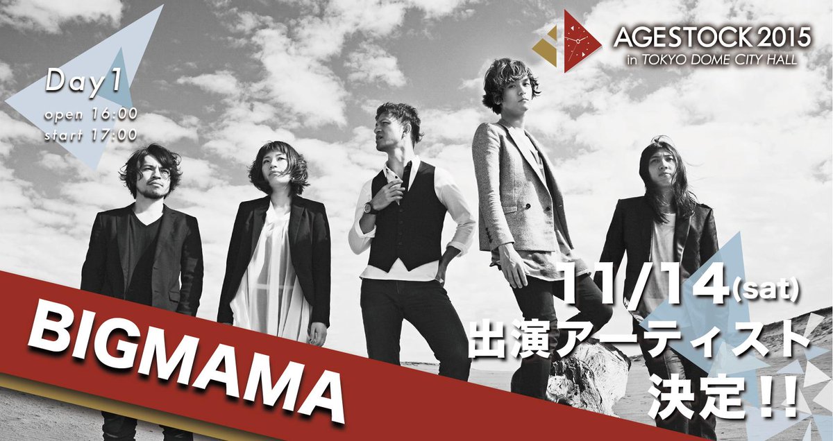 【BIGMAMA出演決定!】11月14日、AGESTOCK2015 in TOKYO DOME CITY HALLに「BIGMAMA」が出演することが決定致しました!詳しくはこちら→agestock.jp/2015