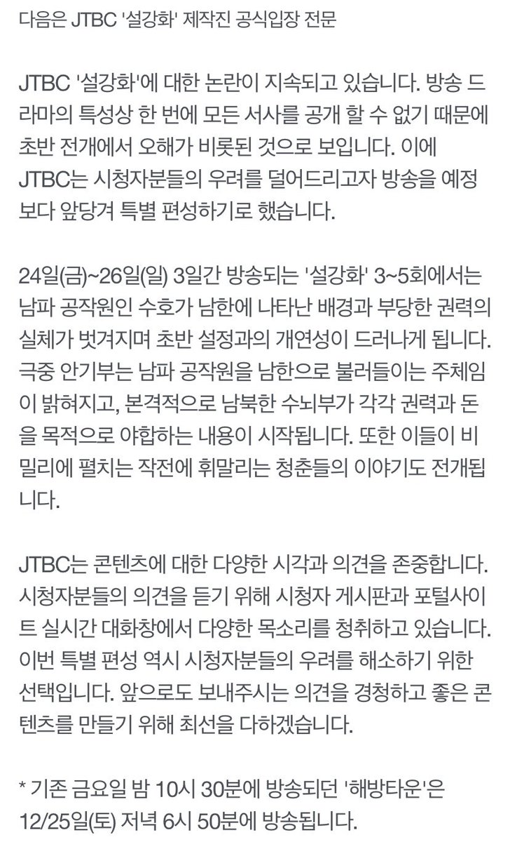 이번주 <설강화>는 12/24(금)~26(일), 3일간 밤 10시 30분에 방송됩니다.