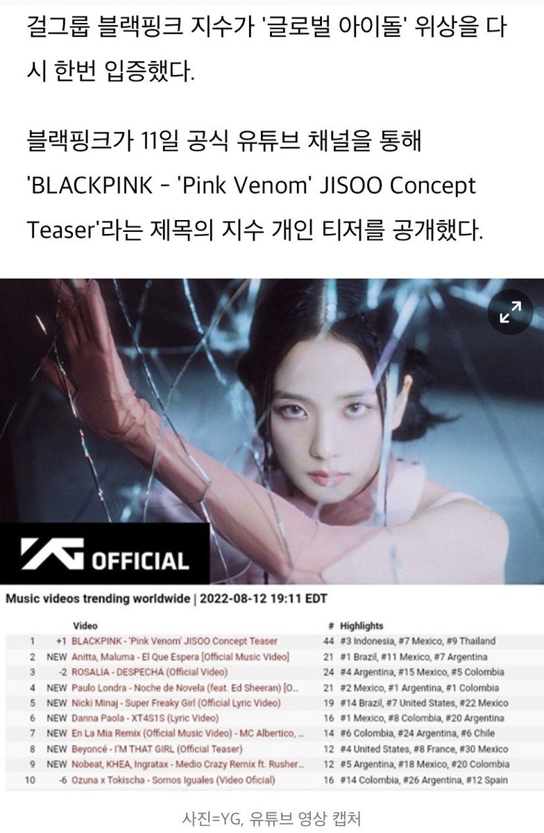 #블랙핑크 #지수 티저, 2022년 최장 유튜브 월드와이드 트렌딩 1위