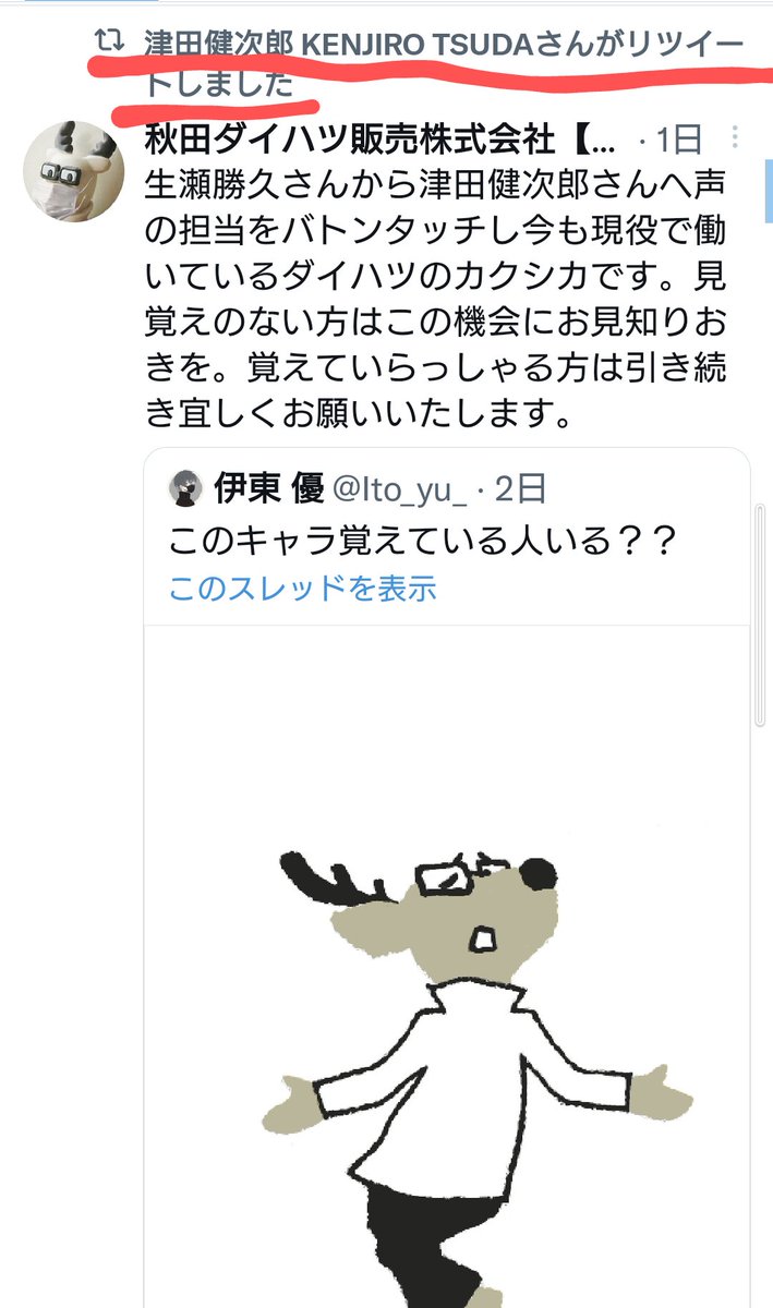 生瀬勝久さんから津田健次郎さんへ声の担当をバトンタッチし今も現役で働いているダイハツのカクシカです。見覚えのない方はこの機会にお見知りおきを。覚えていらっしゃる方は引き続き宜しくお願いいたします。 twitter.com/Ito_yu_/status…