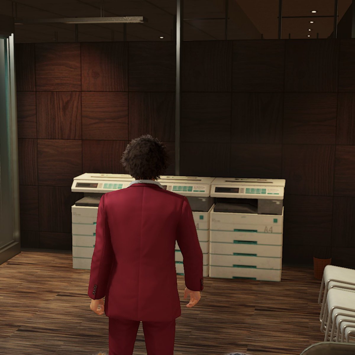龍が如く7、ヤクザの事務所はリアルなのに「高級オフィス」概念は理解が難しいらしくコピー機の物量だけで高級感を出そうとしてくる。