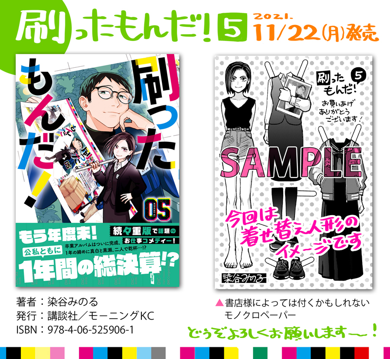 こんな感じのお話が収録されております『刷ったもんだ!』最新5巻が11月22日に発売されます。