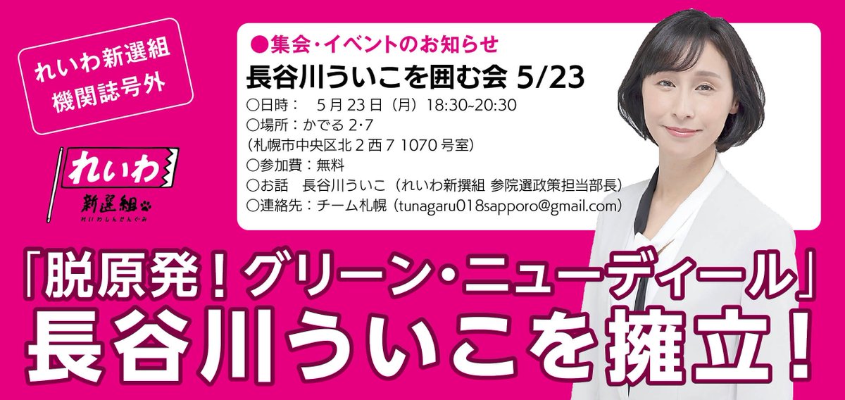 今日です! 「長谷川ういこさんを囲む会」 時間 18:30~20:30 場所 カデル27 1070号室 札幌市中央区北2西7
