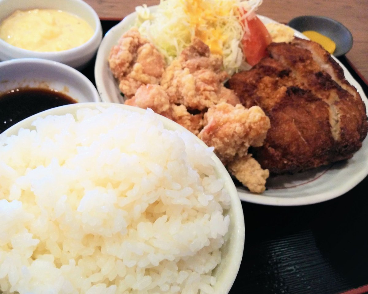 お昼は、チキンカツ&鶏の唐揚げ「チキン・チキン定食」いただきました😄!ごはんも大盛で大満足の食べ応え、ほんとお腹いっぱいになりました😆💕✨!