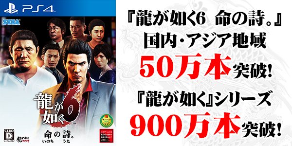 PS4専用ソフト『龍が如く6 命の詩。』 が国内及びアジア地域で50万本突破!2005年12月から続く「龍が如く」は全世界で シリーズ累計900万本突破! ryu-ga-gotoku.com/six/ #ryugagotoku