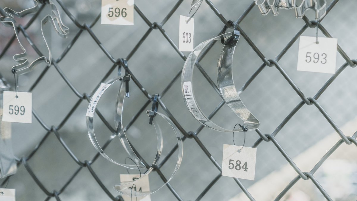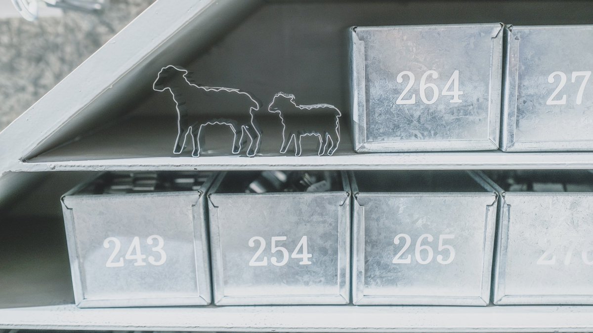 馬嶋屋菓子道具店のクッキータワー。吊り下げられた3,000以上の型の中から、お気に入りの型を見つけて、札の番号の引き出しを探して取り出します。引き出しもパウンドケーキ型でとっても可愛い…💭 私は羊の親子とお月さまを連れて帰りました🐑🐑🌙