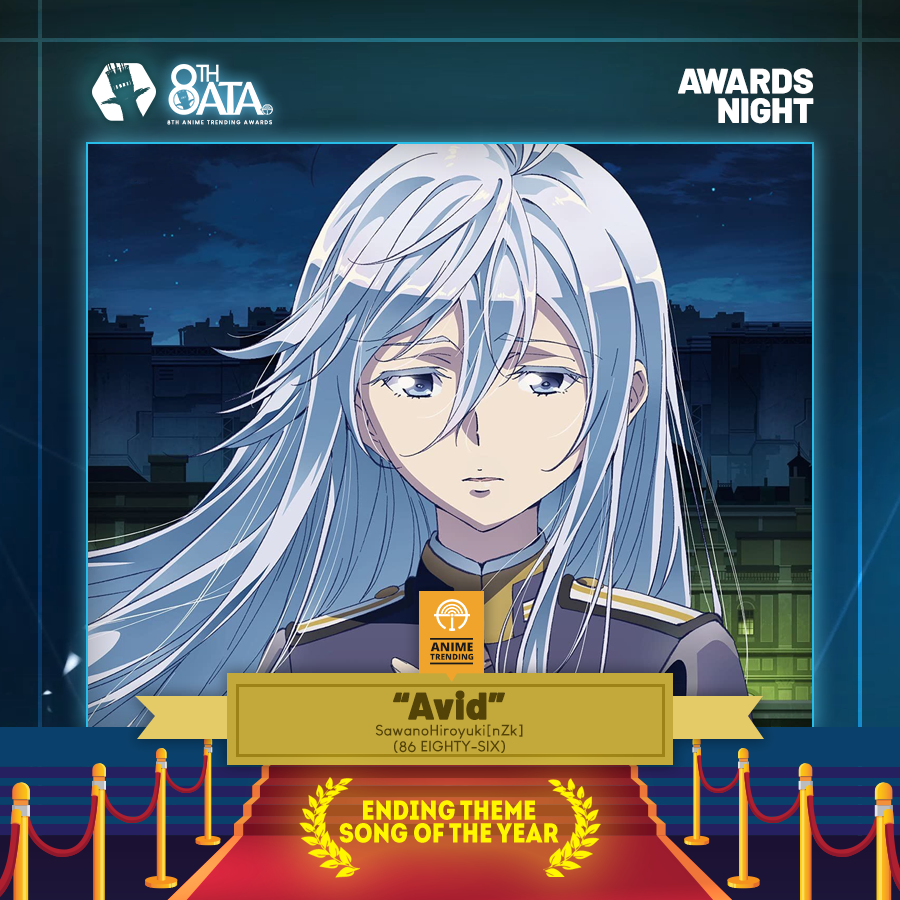 Congratulations to 86 EIGHTY-SIX for winning BEST ENDING THEME SONG at #8thATA! This award goes to SawanoHiroyuki[nZk]:mizuki for the ending. This is 86 EIGHTY-SIX's fourth win tonight.