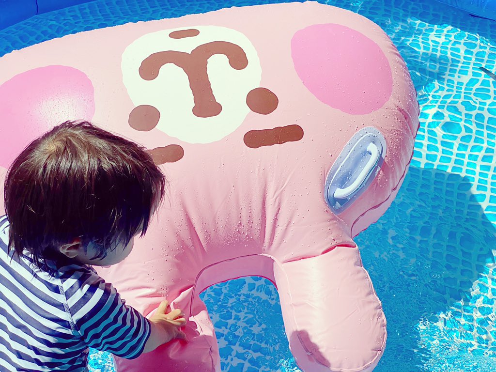 あまりの暑さにビニールプール出しました…!部屋の中で子どもらのクッション扱いされていたうさぎフロート、やっと本来の用途で使えた…!🙏