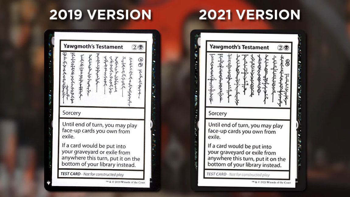 2021版Mystery Booster収録の《Yawgmoth's Testament》のイラストが更新されたのは、2019年版ではファイレクシア語で書かれた「ヨーグモス」の綴り間違い等が含まれていたためだと説明がされた。