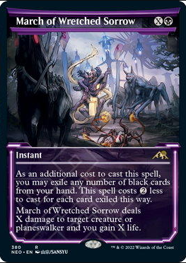 これを唱える追加コストとして、あなたは望む枚数の黒のカードを手札から追放してもよい。このように追放したカード1枚に付きこの呪文を唱える為のコストは(2)少なくなる