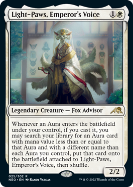あなたのコン卜ロ一ル下でオーラが場に出るたび、あなたがそれを唱えていたなら、あなたのデッキからそのオーラ以下のマナ総量を持ち、あなたがコン卜ロ一ルする各オーラと別の名前を持つオーラカードを1枚探し、これに付けた状態で場に出してもよい。切り直す